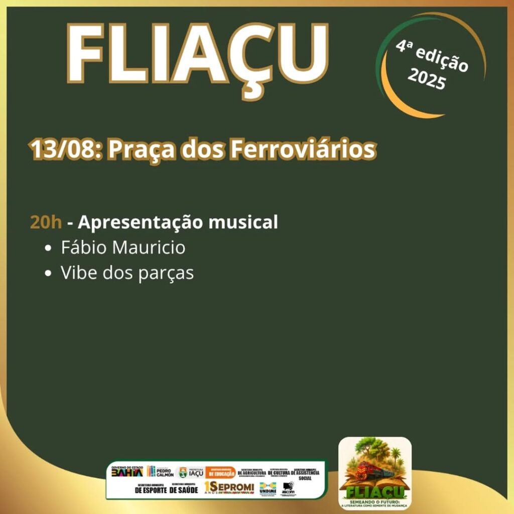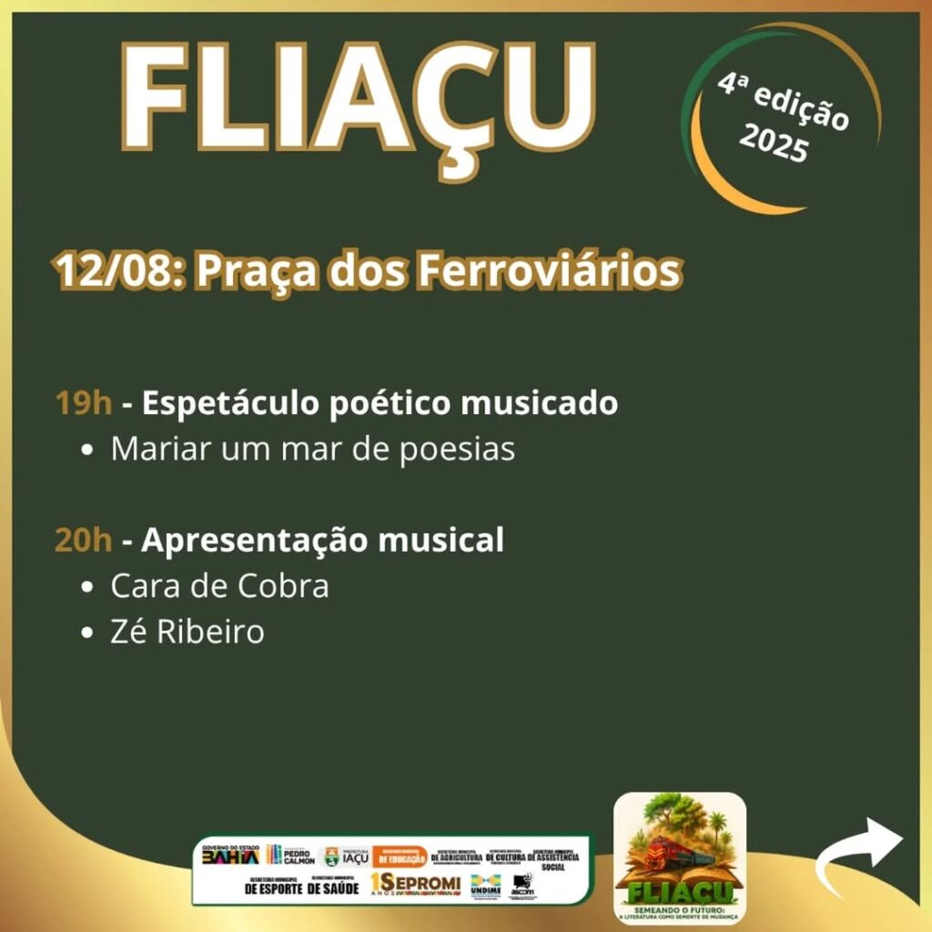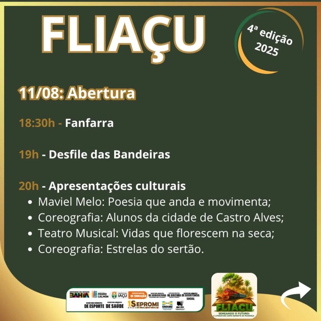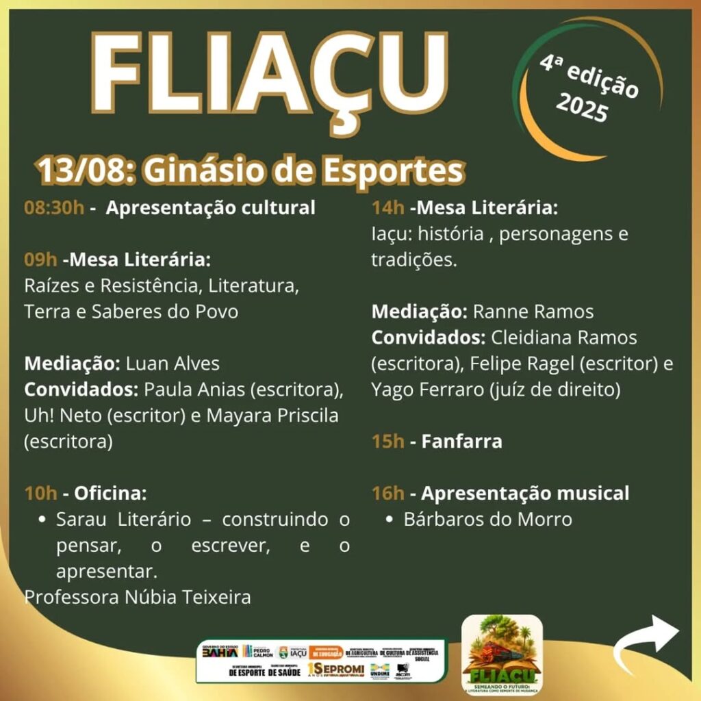 Na próxima segunda-feira, a partir das 18h30, o município de Iaçu inicia a quarta edição de sua festa literária. A Fliaçu é promovida pela Secretaria Municipal de Educação, com o apoio de outros órgãos da administração municipal e do governo estadual, como Fundação Pedro Calmon e Sepromi. A programação vai contar com a participação de Cleidiana Ramos, Kalypsa Brito, Marcos Cajé, Felipe Oliveira, Maviel Melo, Natalyne Santos e Emillie Lapa com o espetáculo Mariar um Mar de Poesias, Grupo Pipa Literarts, dentre outros convidados. As atividades estarão distribuídas por vários espaços da cidade, como a Praça dos Ferroviários, Clube Municipal, Escola Alzira Lima de Aragão e Ginásio de Esportes.